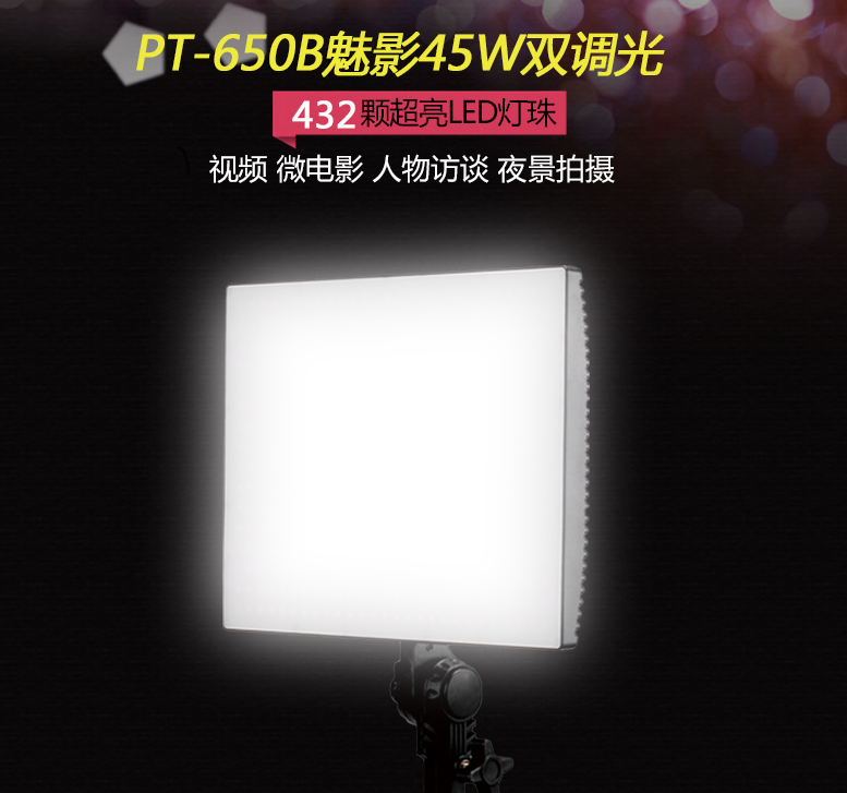 Pt-650b采用的432顆高亮無頻閃led貼片燈珠,能提供穩(wěn)定的高亮度光源。Pt-650b光強(qiáng)達(dá)到600cd以上;光照度在900lux以上。如果達(dá)不到這個標(biāo)準(zhǔn),拍出來的效果就會較暗。