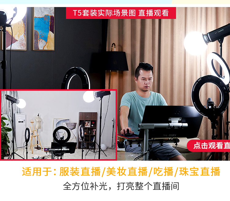 圖立方T8直播套裝配備3臺14寸環(huán)形柔光燈作為主播人物的主要光源。R-25B AC這款燈自帶柔光罩,光線非常柔和,即使是長時間直播也不會感覺刺眼。